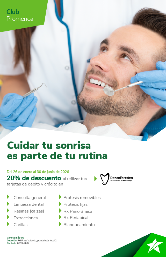 Promoción válida del 26 de enero hasta el 30 de junio de 2026. Recibe 20% en consulta general, limpieza dental, resinas (calzas), extracciones, carillas, prótesis removibles, prótesis fijas, Rx Panorámica, Rx Periapical y blanqueamiento al pagar con tus tarjetas débito o crédito de St. Georges Bank. No aplica en tratamientos de implantes ni con otras promociones o descuentos. No participan tarjetas de crédito regionales ni corporativas. El Banco se reserva el derecho de modificar características y beneficios ofertados en este arte. La responsabilidad del Banco se limita exclusivamente a aspectos propios del crédito otorgado a través de la Tarjeta de Crédito y no por los productos o servicios adquiridos mediante el uso de la tarjeta. Conoce más en www.clubpromerica.com/panama