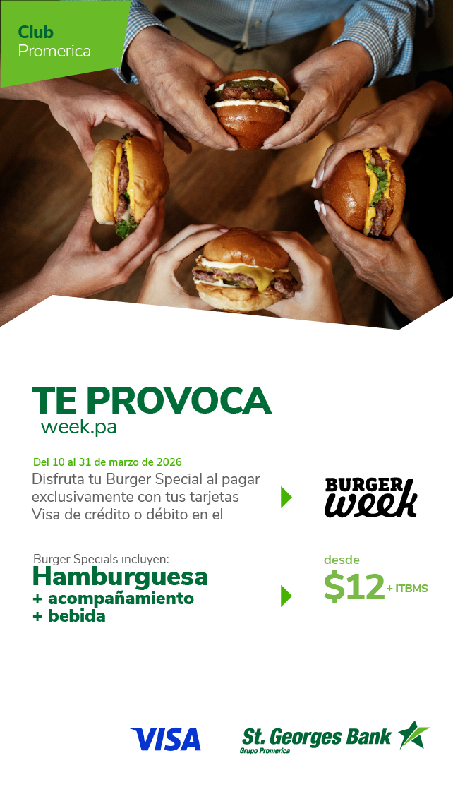 Adquiere tu especial de Burger Week pagando con tu tarjeta de crédito o débito Visa de St. Georges Bank del 10 al 31 de marzo de 2026 en los restaurantes participantes o a través de PedidosYa. Precio de Burger Week no incluye ITBMS, ni propinas. El ITBMS se cargará al momento de la facturación. La propina es opcional y adicional al precio fijo anunciado. No aplican otros descuentos sobre esta promoción. Si no paga con Visa, el restaurante aplicará el precio regular que determine. PICA Productions es responsable del Burger Week, no Visa. Las bebidas son seleccionadas a discreción del restaurante. No aplica las tarjetas empresariales ni regionales. La responsabilidad del Banco se limita exclusivamente a aspectos propios del crédito otorgado a través de la Tarjeta de Crédito y no por los productos o servicios adquiridos mediante el uso de la tarjeta.