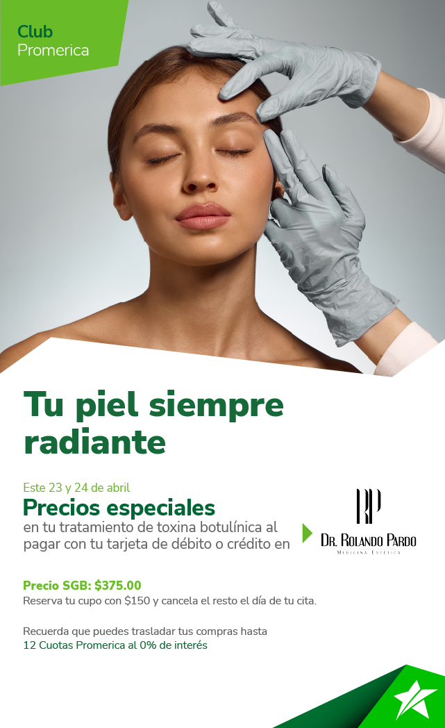 Promoción válida el 23 y 24 de abril de 2026. Recibe precio especial al pagar tu tratamiento de toxina botulínica con tu tarjeta débito o crédito de St. Georges Bank. Incluye retoque. Al agendar tu cita recibe el 30% de descuento en una sesión a elegir de: PDRN, Exosomas, NCTF, Fotoage o Hidratación facial. No aplica con otras promociones o descuentos. Solicita el beneficio de traslado a Cuotas Promerica hasta 12 meses al 0% de interés directo en el punto de venta (POS) de El Banco. El cliente debe realizar el pago de la cuota en la fecha indicada para mantener la tasa preferencial, adicional al pago mínimo correspondiente. La compra mínima para traslado a Cuotas es de $50.00. Cuotas Promerica va ligado al límite de crédito del cliente, no es un extrafinanciamiento. Aplica cargo por póliza de deuda sobre saldo. No participan las tarjetas de crédito regionales ni corporativas. La responsabilidad del Banco se limita exclusivamente a aspectos propios del crédito otorgado a través de la Tarjeta de Crédito y no por los productos o servicios adquiridos mediante el uso de la tarjeta. Conoce más en www.clubpromerica.com/panama.