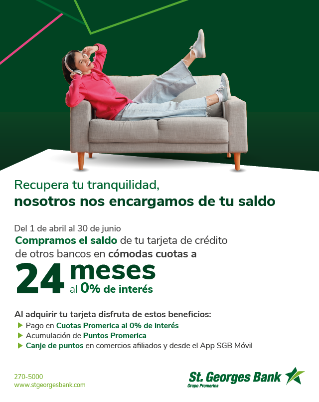 Promoción válida del 1 de abril al 30 de junio de 2026. Promoción aplica para cuentas nuevas por compra de saldo de tarjetas de crédito de otros bancos a partir de $250.00. Tasas y plazo sujeto a evaluación, verificación y aprobación de crédito. Los plazos de financiamiento 3, 6, 9, 12, 15, 18 y 24 meses con tasa de interés del 0% están condicionadas a una (1) compra al mes, de lo contrario se aplicará la tasa regular de 8.50%. Para tarjetas Business (Corporativas y PYMES) la tasa es de 0% de interés a plazos de 3 meses por un monto mínimo $500.00. La compra de saldo no debe exceder el 70% del límite de crédito aprobado. Aplica cargo por servicio de compra de saldo de $35.00 y seguro de saldo de deuda más ITBMS. La Compra de Saldo no aplica para acumulación de Puntos Promerica, ni cashback, tarjetas de crédito acogidas a ley de moratoria, bloqueadas, con pago atrasado o sobregiro en otros bancos. De presentar mora de 30 días en adelante, el saldo de la línea regular pasará a tasa moratoria y a tasa regular del producto una vez se realice el pago correspondiente, de la misma manera se aplicará un cargo administrativo por pago atrasado. El Banco se reserva el derecho de realizar cambios o modificaciones en las características, beneficios y promociones ofertadas en este arte.