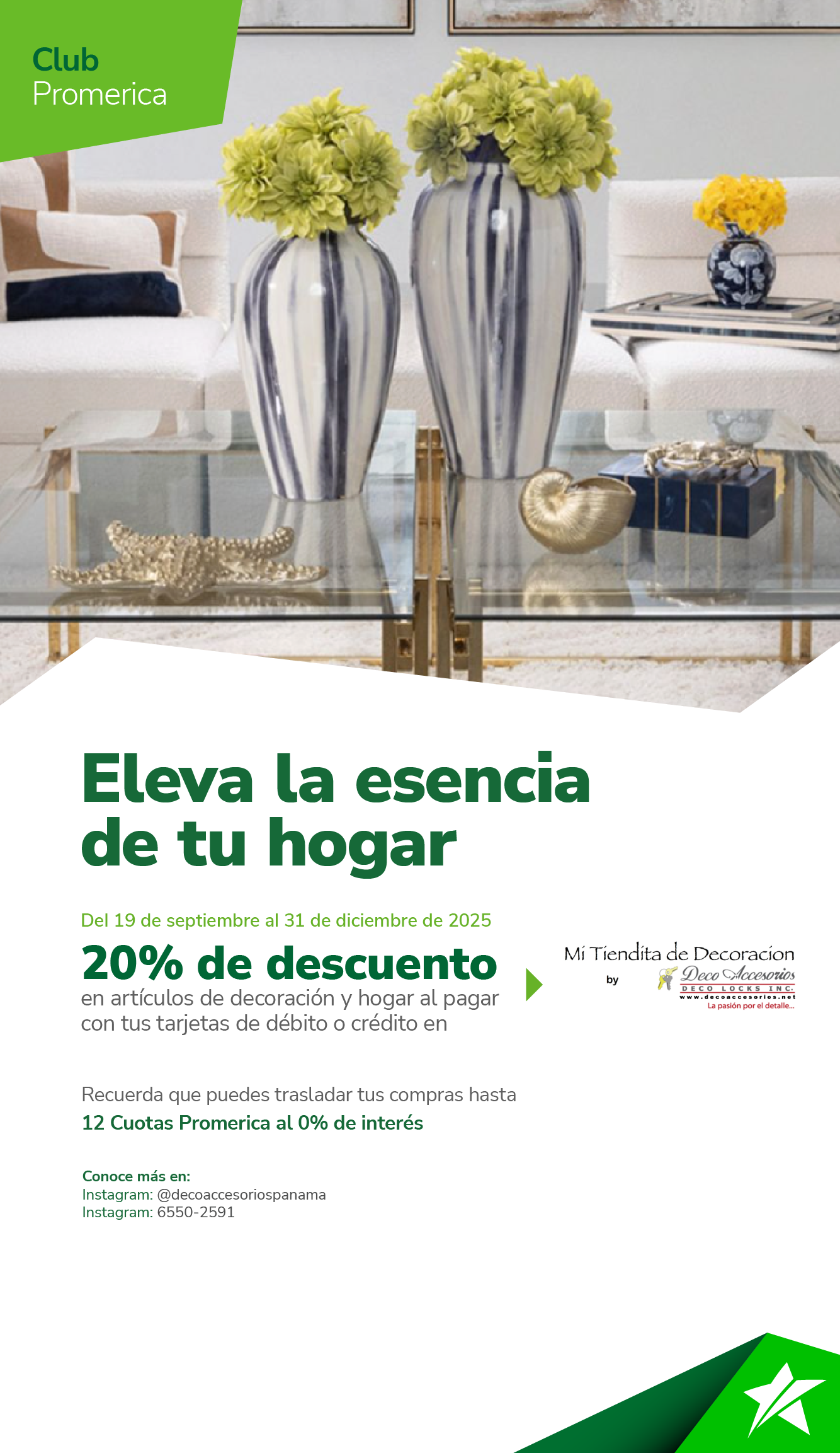 Promoción válida del 19 de septiembre hasta el 31 de diciembre de 2025. Recibe 20% de descuento en Deco Accesorios al pagar con tus tarjetas débito o crédito de St. Georges Bank. No participan productos del outlet. No aplican otras promociones o descuentos. Solicita el beneficio de traslado a Cuotas Promerica hasta 12 meses al 0% de interés directo en el punto de venta (POS) de El Banco. El cliente debe realizar el pago de la cuota en la fecha indicada para mantener la tasa preferencial, adicional al pago mínimo correspondiente. La compra mínima para traslado a Cuotas es de $50.00. Cuotas Promerica va ligado al límite de crédito del cliente, no es un extrafinanciamiento. Aplica cargo por póliza de deuda sobre saldo. No participan las tarjetas de crédito regionales ni corporativas. El Banco se reserva el derecho de modificar características y beneficios ofertados en este arte. La responsabilidad del Banco se limita exclusivamente a aspectos propios del crédito otorgado a través de la Tarjeta de Crédito y no por los productos o servicios adquiridos mediante el uso de la tarjeta. Conoce más en www.clubpromerica.com/panama
