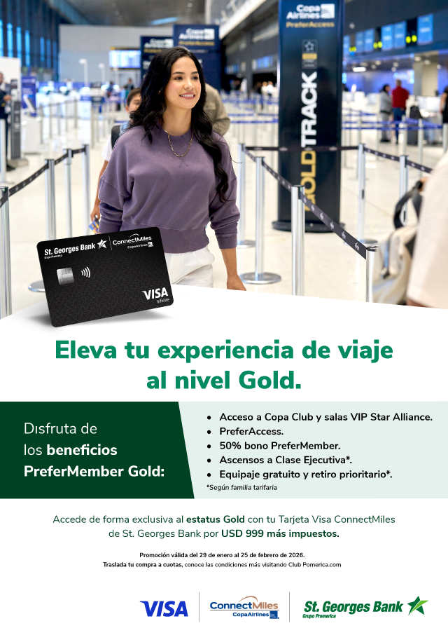 Promoción válida del 29 de enero al 25 de febrero del 2026. Esta Promoción es válida únicamente para las tarjetas de crédito ConnectMiles Infinite de St. Georges Bank que reciban esta comunicación de parte del Banco. El miembro ConnectMiles tendrá disponible el estatus PreferMember Gold por un valor de B/. 999.00 más impuestos. Adicional, podrá solicitar trasladar este monto a cuotas hasta 12 meses al 0% de interés. La compra de estatus no será reembolsable una vez el cliente acepte el débito de su tarjeta de crédito. El estatus será asignado en un máximo de 30 días luego de su solicitud. La vigencia del estatus PreferMember Gold será hasta febrero de 2027. La asignación del estatus PreferMember Gold solamente consiste en el estatus más no incluye las millas de calificación y/o segmentos requeridos para dicho estatus. Para obtener un estatus superior al estatus PreferMember Gold, el tarjetahabiente deberá acumular las millas y/o segmentos de calificación requeridos. Se permite la compra de un máximo de dos (2) estatus PreferMember Gold por cuenta ConnectMiles Infinite elegible: tarjetahabiente titular más un adicional o dos tarjetahabientes adicionales. El estatus PreferMember Gold adquirido será removido si la tarjeta es cancelada, al igual que otros beneficios asociados a la tarjeta de crédito de marca compartida. ConnectMiles se reserva el derecho de cambiar, suspender o modificar La Promoción o estos términos y condiciones en cualquier momento. La responsabilidad del Banco se limita exclusivamente a aspectos propios del crédito otorgado a través de la Tarjeta de Crédito y no por los productos o servicios adquiridos mediante el uso de la tarjeta. Conoce más en www.clubpromerica.com/panama.