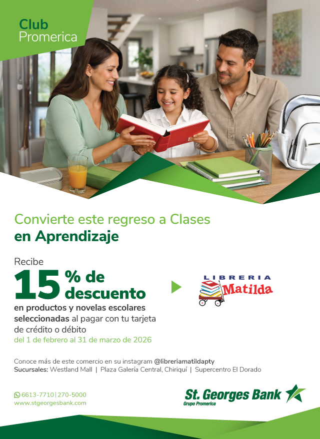 Promoción válida del 1 de febrero al 31 de marzo de 2026. Recibe 15% de descuento en productos escolares, didácticos e infantiles de la línea Andreita y Chepito, Novelas escolares de la autora panameña Rose Marie Tapia (Roberto por el buen camino, Niña bella, Travesías Mágicas, Los ángeles del olvido, El grito desde el silencio, El arcoíris en el pantano y El maestro de los sueños) y diccionarios al pagar con tus tarjetas débito o crédito de St. Georges Bank. Sujeto a disponibilidad de inventario. No acumulable con otras promociones, descuentos, precios especiales o cupones vigentes. No aplica en preventa, pedidos especiales ni productos bajo solicitud. No participan las tarjetas corporativas ni regionales. El Banco se reserva el derecho de modificar características y beneficios ofertados en este arte. La responsabilidad del Banco se limita exclusivamente a aspectos propios del crédito otorgado a través de la Tarjeta de Crédito y no por los productos o servicios adquiridos mediante el uso de la tarjeta.