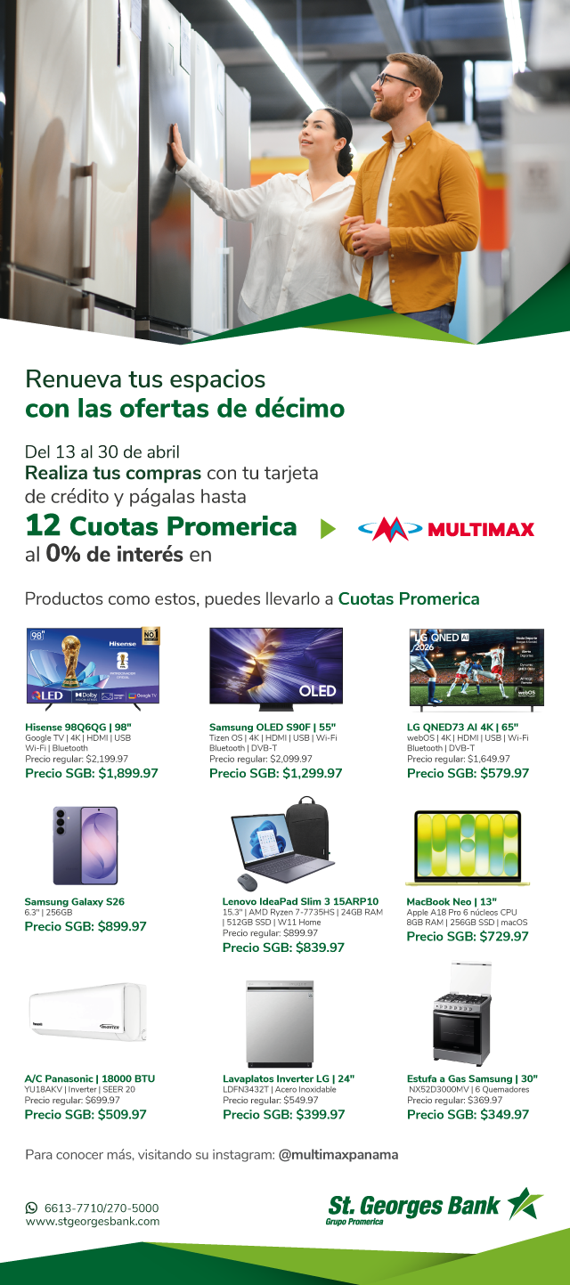 Promoción válida del 13 al 30 de abril de 2026 o hasta agotar existencia. Traslada tu compra a 12 cuotas al 0% de interés con tu tarjeta de crédito Multimax de St. Georges Bank. La compra mínima para trasladar a cuotas es de $50.00 y va ligado al límite de crédito del cliente, no es un extrafinanciamiento. Aplica cargo por póliza de deuda sobre saldo. No participan las tarjetas de crédito corporativas ni regionales. La responsabilidad del Banco se limita exclusivamente a aspectos propios del crédito otorgado a través de la tarjeta de crédito y no por los productos o servicios adquiridos mediante el uso de la tarjeta. Conoce más en clubpromerica.com.