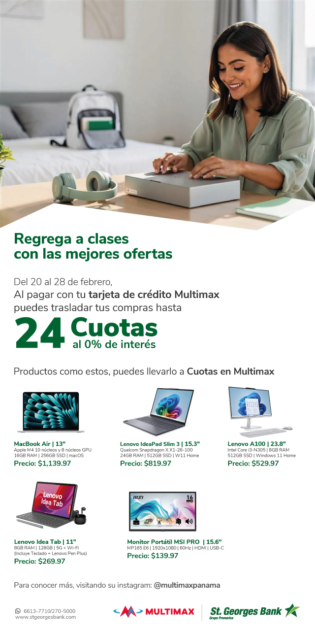 Promoción válida del 20 al 28 de febrero de 2026 o hasta agotar existencia. Traslada tu compra a 24 cuotas al 0% de interés con tu tarjeta de crédito Multimax de St. Georges Bank. La compra mínima para trasladar a Cuotas es de $50.00 y va ligado al límite de crédito del cliente, no es un extrafinanciamiento. Aplica cargo por póliza de deuda sobre saldo. No participan las tarjetas de crédito corporativas ni regionales. La responsabilidad del Banco se limita exclusivamente a aspectos propios del crédito otorgado a través de la tarjeta de crédito y no por los productos o servicios adquiridos mediante el uso de la tarjeta. Conoce más en clubpromerica.com/panama.