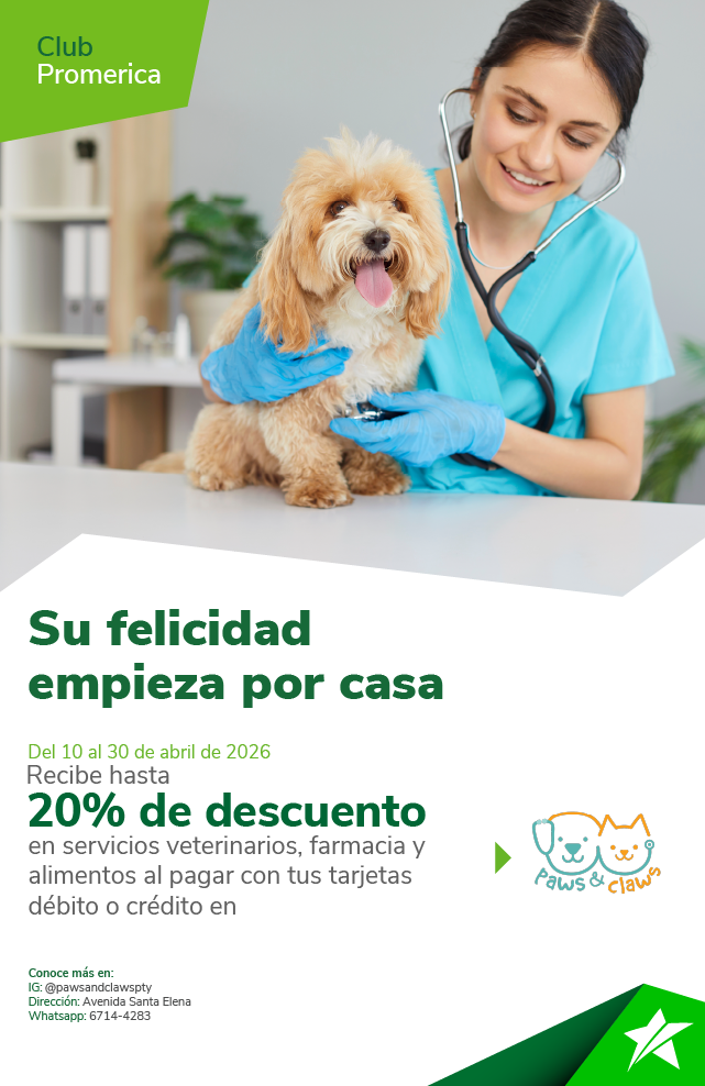 Promoción válida del 6 al 30 de abril de 2026. Recibe 20% de descuento en vacunas (caninos y felinos), 15% de descuento en laboratorio y 10% de descuento en farmacia y alimentos al pagar con tus tarjetas débito o crédito de St. Georges Bank. No aplican con otras promociones o descuentos. Atención en horario regular, por orden de llegada. No participan tarjetas de crédito regionales ni corporativas. El Banco se reserva el derecho de modificar características y beneficios ofertados en este arte. La responsabilidad del Banco se limita exclusivamente a aspectos propios del crédito otorgado a través de la Tarjeta de Crédito y no por los productos o servicios adquiridos mediante el uso de la tarjeta. Conoce más en www.clubpromerica.com/panama