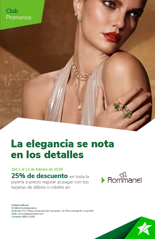 Promoción válida del 2 al 13 de febrero de 2026. Recibe un 25% de descuento en compras en toda la joyería en precio regular al pagar con tus tarjetas débito o crédito de St. Georges Bank. No aplica con otras promociones o descuentos. El Banco se reserva el derecho de modificar características y beneficios ofertados en este arte. La responsabilidad del Banco se limita exclusivamente a aspectos propios del crédito otorgado a través de la Tarjeta de Crédito y no por los productos o servicios adquiridos mediante el uso de la tarjeta. Conoce más en clubpromerica.com/panama/.