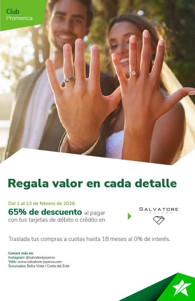 Promoción válida del 1 al 13 de febrero de 2026. Recibe 65% de descuento al pagar con tus tarjetas débito o crédito de St. Georges Bank. No aplica con otras promociones o descuentos. Solicita el beneficio de Cuotas Promerica hasta 18 meses al 0% de interés llamando al call center 270-5000, a más tardar tres (3) días antes de su fecha de corte del estado de cuenta. Aplica cargo administrativo y cargo por póliza de deuda sobre saldo. No participan las tarjetas de crédito regionales ni corporativas. Cuotas Promerica va ligado al límite de crédito del cliente, no es un extrafinanciamiento. Tarjetas débito no aplican a traslado a cuotas. El Banco se reserva el derecho de modificar características y beneficios ofertados en este arte. La responsabilidad del Banco se limita exclusivamente a aspectos propios del crédito otorgado a través de la tarjeta de crédito y no por los productos o servicios adquiridos mediante el uso de la tarjeta. Conoce más en clubpromerica.com/panama.