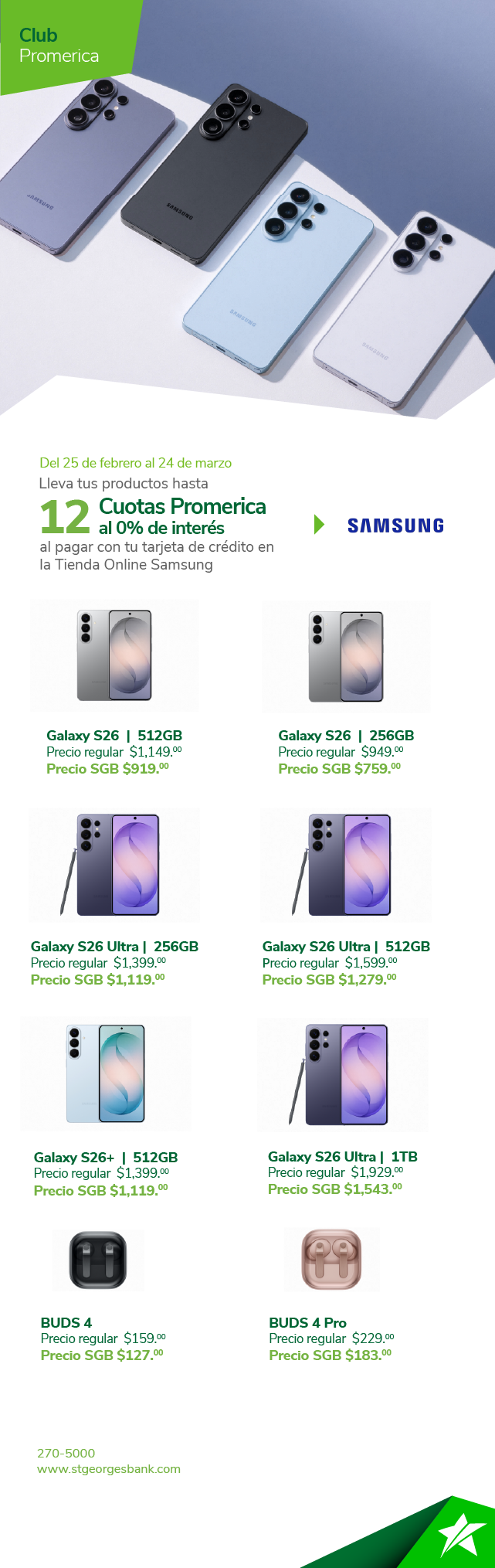 Promoción válida del 25 de febrero al 24 de marzo de 2026 o hasta agotar existencias. Recibe precio especial únicamente aplicable a compras realizadas en la Tienda Online de Samsung: https://shop.samsung.com/latin/ para clientes que paguen con la tarjeta de crédito de St. George Bank. Cantidades limitadas. Promoción sujeta a disponibilidad de inventario. Los modelos pueden variar según disponibilidad. Las imágenes de los productos son para fines ilustrativos y pueden diferir del producto real. Precios no incluyen impuestos. Solicita el beneficio de Cuotas Promerica a 12 meses al 0% de interés por tu compra realizada en la página web de Samsung al call center 270-5000, a más tardar tres (3) días antes de su fecha de corte del estado de cuenta. Aplica cargo administrativo y cargo por póliza de deuda sobre saldo. No participan las tarjetas de crédito regionales ni corporativas. Cuotas Promerica va ligado al límite de crédito del cliente, no es un extrafinanciamiento. El Banco se reserva el derecho de modificar características y beneficios ofertados en este arte. La responsabilidad del Banco se limita exclusivamente a aspectos propios del crédito otorgado a través de la tarjeta de crédito y no por los productos o servicios adquiridos mediante el uso de la tarjeta. Advance Commercial Services se reserva el derecho a modificación y/o cancelación de las órdenes sin previo aviso. POLÍTICA DE PRIVACIDAD: Consulta la Política de Privacidad de Samsung en el link Privacidad. Conoce más en clubpromerica.com/panama.