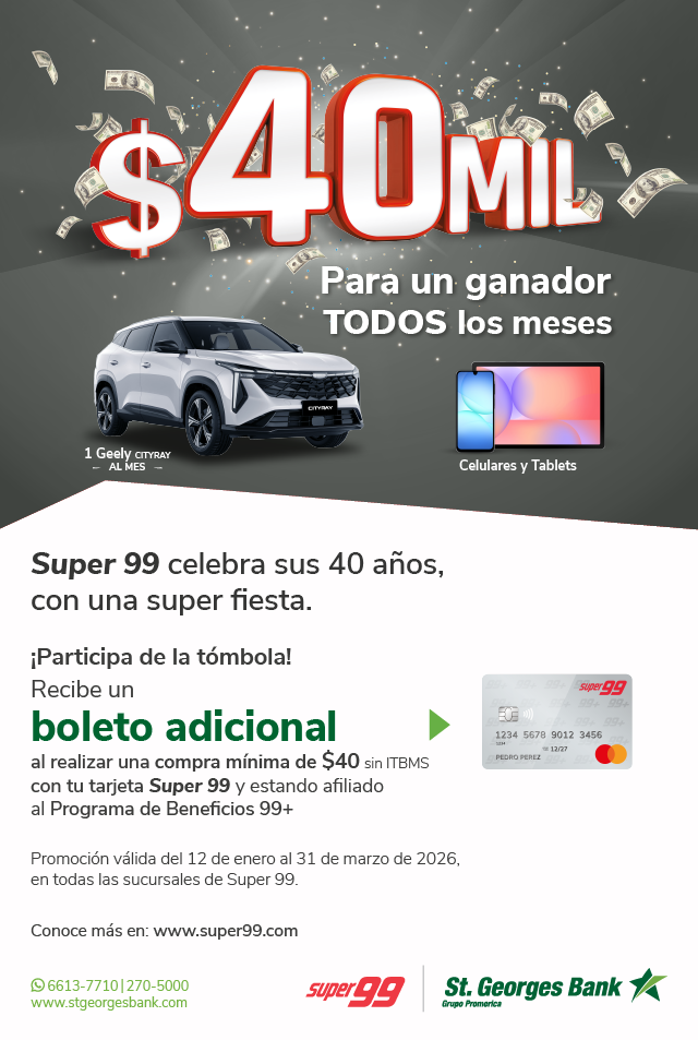 Promoción aprobada por la JCJ, Resolución N° MEF-RES-2026-6 del 5 de enero de 2026. Promoción válida del lunes 12 de enero al martes 31 de marzo de 2026. Al estar afiliado al Programa de Beneficios 99+, por cada B/.40.00 (sin incluir ITBMS), el cliente recibe un boleto para participar en una tómbola mensual. Los buzones se retirarán de todas las sucursales el 31 de marzo de 2026, previo al cierre de nuestras sucursales. Los boletos no son acumulables. No se aceptarán boletos el día de la tómbola, se llamará tres (3) veces al primer número para informar que es el ganador, de no responder se anulará el mismo y se sacará otro boleto. Fecha, hora y lugar de las tómbolas: 6 de febrero de 2026 a las 10:30 A.M. en Montemadero - 6 de marzo de 2026 a las 10:30 a.m. en Colón 2,000 - 7 de abril de 2026 a las 10:30 a.m. en Penonomé. Para conocer los premios por tómbola y todas las condiciones y restricciones visitar www.super99.com