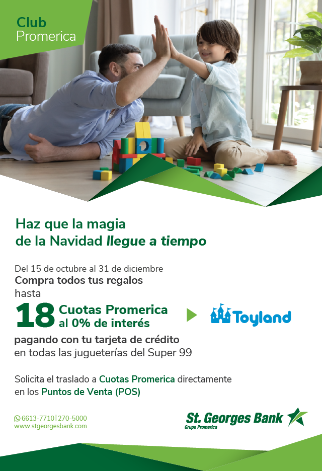 Promoción válida del 15 de octubre al 31 de diciembre de 2025. Traslada tus compras a 3, 6, 9, 12 y 18 meses al 0% de interés al comprar en el departamento de juguetería de los Super 99 con tus tarjetas de crédito de St. Georges Bank. Aplica para compra mínima de $50.00. No aplican tarjetas regionales ni corporativas. Cuotas Promerica va ligado al límite de crédito del cliente, no es un extrafinanciamiento. Aplica cargo por póliza de deuda sobre saldo. Compras a Cuotas Promerica no aplica para acumulación de Puntos Promerica. El Banco se reserva el derecho de modificar características y beneficios ofertados en este arte. La responsabilidad del Banco se limita exclusivamente a aspectos propios del crédito otorgado a través de la Tarjeta de Crédito y no por los productos o servicios adquiridos mediante el uso de la tarjeta. Conoce más en www.clubpromerica.com/panama