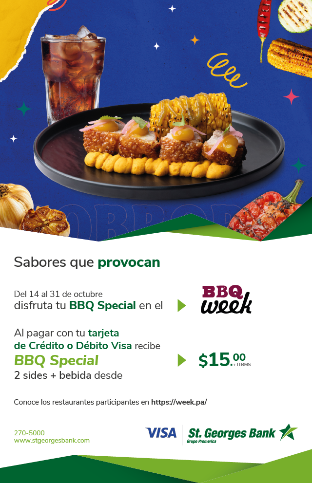 Adquiere tu especial de BBQ Week pagando con tus tarjetas de Crédito o Débito Visa de St. Georges Bank del 14 al 31 de octubre de 2025 en los restaurantes participantes o a través de PedidosYa. Precio de BBQ Week no incluye ITBMS, ni propinas. El ITBMS se cargará al momento de la facturación. La propina es opcional y adicional al precio fijo anunciado. No aplican otros descuentos sobre esta promoción. El precio puede variar en delivery. Si no paga con Visa, cada restaurante aplicará el precio regular que determine. PICA Productions es responsable del BBQ Week, no Visa. Para conocer el detalle de restaurantes participantes y sus especiales entra a: https://week.pa/ . No aplican las tarjetas empresariales ni regionales. La responsabilidad del Banco se limita exclusivamente a aspectos propios del crédito otorgado a través de la tarjeta de crédito y no por los productos o servicios adquiridos mediante el uso de la tarjeta.