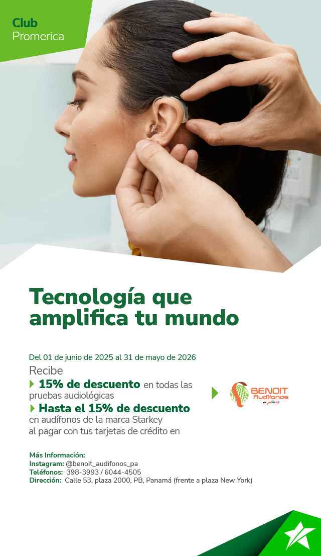 Promoción válida 01 de junio hasta el 31 de mayo de 2026. Recibe 15% de descuento en todas las pruebas audiológicas y hasta un 15% de descuento en audífonos de la marca Starkey al pagar con tus tarjetas de crédito St. Georges Bank. Este descuento será otorgado directamente por el comercio. No aplica con otros descuentos. No participan las tarjetas de crédito regionales ni corporativas. El Banco se reserva el derecho de modificar características y beneficios ofertados en este arte. La responsabilidad del Banco se limita exclusivamente a aspectos propios del crédito otorgado a través de la tarjeta de crédito y no por los productos o servicios adquiridos mediante el uso de la tarjeta. Conoce más en www.clubpromerica.com/panama.