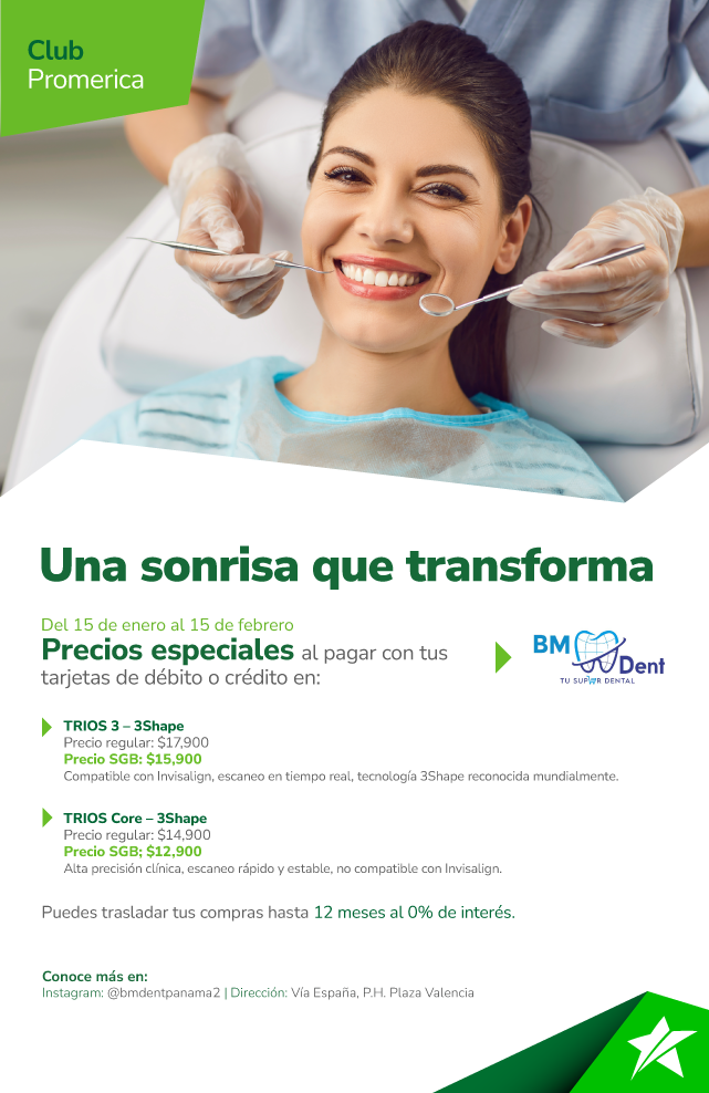 Promoción válida del 15 de enero al 15 de febrero de 2026. Recibe precios especiales al pagar tu TRIOS 3 – 3Shape y TRIOS Core – 3Shape con tus tarjetas débito o crédito de St. Georges Bank. No aplica con otras promociones o descuentos. No participan tarjetas de crédito regionales ni corporativas. Solicita el beneficio de traslado a Cuotas Promerica hasta 12 meses al 0% de interés directo en el punto de venta (POS) de El Banco. El cliente debe realizar el pago de la cuota en la fecha indicada para mantener la tasa preferencial, adicional al pago mínimo correspondiente. La compra mínima para traslado a Cuotas es de $50.00. Cuotas Promerica va ligado al límite de crédito del cliente, no es un extrafinanciamiento. Aplica cargo por póliza de deuda sobre saldo. El Banco se reserva el derecho de modificar características y beneficios ofertados en este arte. La responsabilidad del Banco se limita exclusivamente a aspectos propios del crédito otorgado a través de la Tarjeta de Crédito y no por los productos o servicios adquiridos mediante el uso de la tarjeta. Conoce más en www.clubpromerica.com/panama