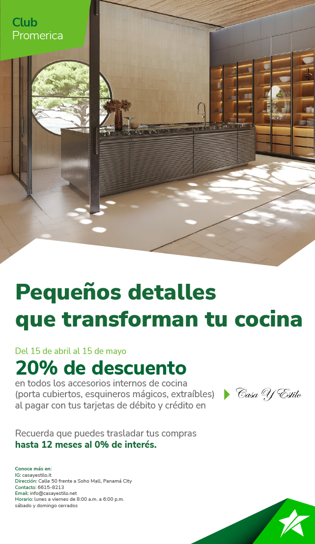 Promoción válida del 15 de abril al 15 de mayo de 2026 o hasta agotar existencia. Recibe 20% de descuento en todos los accesorios internos de cocina (porta cubiertos, esquineros mágicos, extraíbles) al pagar con tus tarjetas débito o crédito de St. Georges Bank. Promociones no son acumulables con otras ofertas, descuentos o promociones vigentes. Descuento no aplica sobre productos ya rebajados o en liquidación. El descuento se aplica sobre el precio regular de lista, antes de impuestos y gastos de envío o instalación. No se aceptan devoluciones de dinero en productos adquiridos bajo esta promoción. En caso de requerir un cambio (por defecto de fábrica), se reconocerá el valor pagado por el cliente, no el precio regular. Solicita el beneficio de traslado a Cuotas Promerica hasta 12 meses al 0% de interés directo en el punto de venta (POS) de El Banco. El cliente debe realizar el pago de la cuota en la fecha indicada para mantener la tasa preferencial, adicional al pago mínimo correspondiente. La compra mínima para traslado a Cuotas es de $50.00. Cuotas Promerica va ligado al límite de crédito del cliente, no es un extrafinanciamiento. Aplica cargo por póliza de deuda sobre saldo. No participan las tarjetas de crédito regionales ni corporativas. La responsabilidad del Banco se limita exclusivamente a aspectos propios del crédito otorgado a través de la Tarjeta de Crédito y no por los productos o servicios adquiridos mediante el uso de la tarjeta. Conoce más en www.clubpromerica.com/panama.