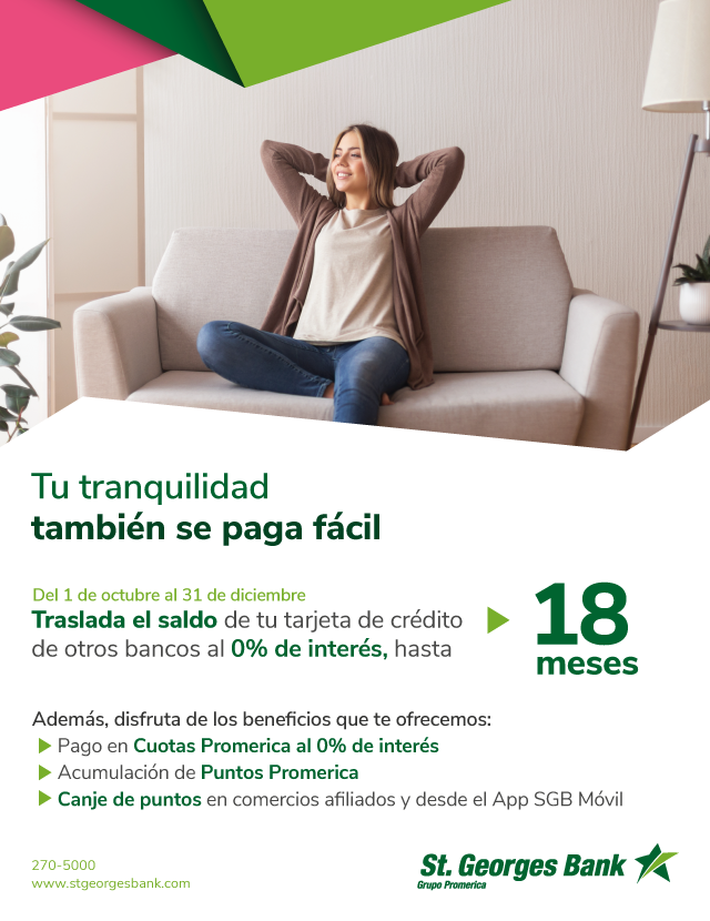 Promoción válida del 1 de octubre hasta el 31 de diciembre de 2025. Promoción aplica para cuentas nuevas por compra de saldo de tarjetas de crédito de otros bancos a partir de $250.00. Tasas y plazo sujeto a evaluación, verificación y aprobación de crédito. Los plazos de financiamiento 3, 6, 9, 12, 15 y 18 meses con tasa de interés del 0% están condicionadas a una (1) compra al mes, de lo contrario se aplicará la tasa regular de 8.50%. Para tarjetas Business (Corporativas y PYMES) la tasa es de 0% de interés a plazos de 3 meses por un monto mínimo $500.00. La compra de saldo no debe exceder el 70% del límite de crédito aprobado. Aplica cargo por servicio de compra de saldo de $35.00 y seguro de saldo de deuda más ITBMS. La Compra de Saldo no aplica para acumulación de Puntos Promerica, cashback, tarjetas de crédito acogidas a ley de moratoria, bloqueadas, con pago atrasado o sobregiro en otros bancos.