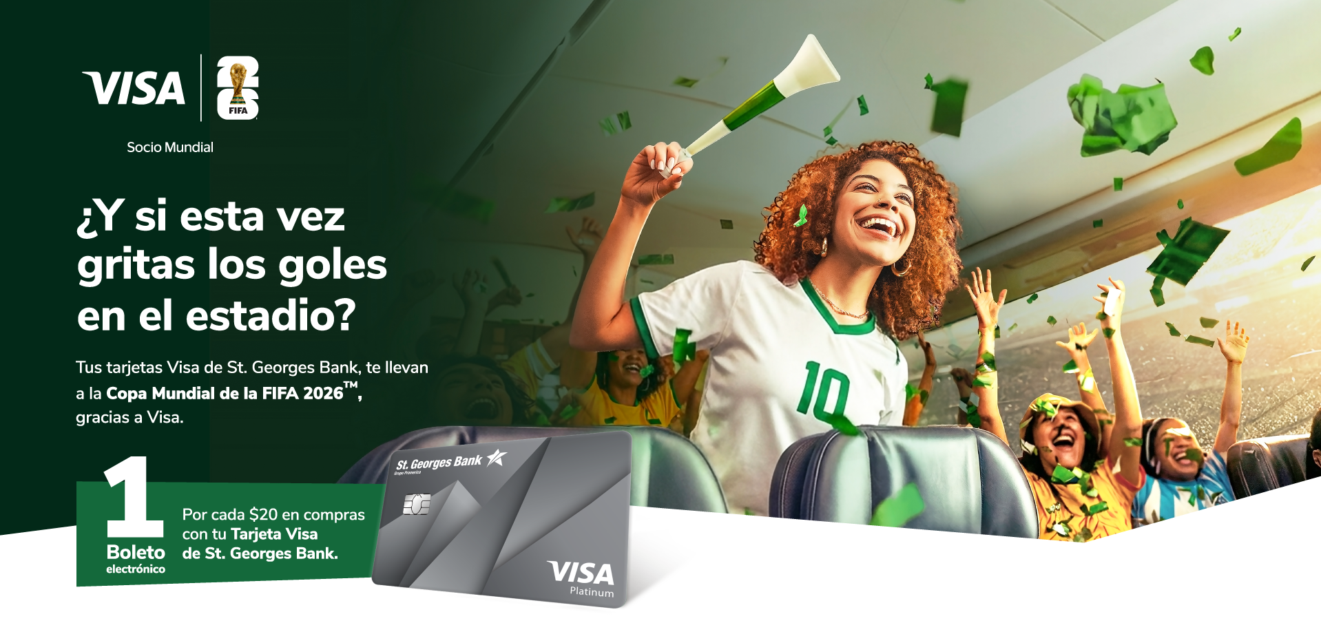 ¡Vive la emoción del mundial en vivo gracias a St. Georges Bank y Visa! Participar es muy fácil: utiliza tus tarjetas de crédito o débito Visa de St. Georges Bank del 19 de diciembre de 2025 al 31 de marzo de 2026 y prepárate para gritar ¡gol!