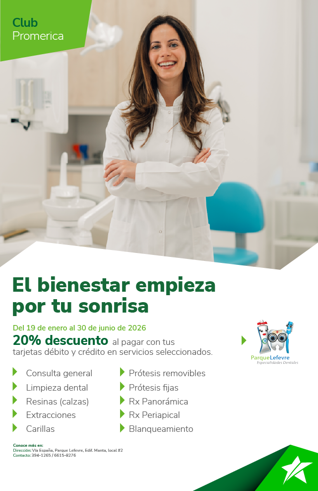 Promoción válida del 19 de enero hasta el 30 de junio de 2026. Recibe 20% en consulta general, limpieza dental, resinas (calzas), extracciones, carillas, prótesis removibles, prótesis fijas, Rx Panorámica, Rx Periapical y blanqueamiento al pagar con tus tarjetas débito o crédito de St. Georges Bank. No aplica en tratamientos de implantes ni con otras promociones o descuentos. No participan tarjetas de crédito regionales ni corporativas. El Banco se reserva el derecho de modificar características y beneficios ofertados en este arte. La responsabilidad del Banco se limita exclusivamente a aspectos propios del crédito otorgado a través de la Tarjeta de Crédito y no por los productos o servicios adquiridos mediante el uso de la tarjeta. Conoce más en www.clubpromerica.com/panama