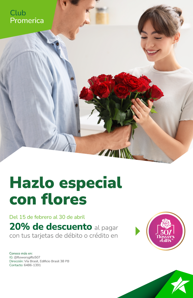 Promoción válida del 15 de febrero al 30 de abril de 2026. Recibe un 20% de descuento al pagar tus tarjetas débito o crédito de St. Georges Bank en Flowers Gifts. Esta promoción no es válida con otras promociones o descuentos. No participan las tarjetas de crédito regionales ni corporativas. El Banco se reserva el derecho de modificar características y beneficios ofertados en este arte. La responsabilidad del Banco se limita exclusivamente a aspectos propios del crédito otorgado a través de la tarjeta de crédito y no por los productos o servicios adquiridos mediante el uso de la tarjeta. Conoce más en www.clubpromerica.com/panama