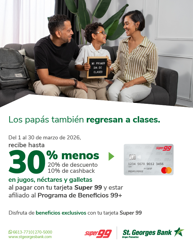 Promoción válida del 01 al 30 de marzo de 2026. Recibe 10% de cashback y 20% de descuento en jugos, néctares y galletas al pagar con las tarjetas de crédito Super 99 de St. Georges Bank. Descuento aplica solo para los clientes afiliados al Programa de Beneficios 99+.El Banco se reserva el derecho de modificar características y beneficios ofertados en este arte. La responsabilidad del Banco se limita exclusivamente a aspectos propios del crédito otorgado a través de la Tarjeta de Crédito y no por los productos o servicios adquiridos mediante el uso de la tarjeta. Conoce más en www.clubpromerica.com/panama
