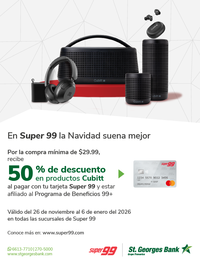 Promoción válida del 26 de noviembre de 2025 al 6 de enero de 2026. Al realizar una compra mínima de $29.99 (sin incluir ITBMS) con las tarjetas de crédito Super 99 St. Georges Bank y estar afiliado al Programa de Beneficios 99+, llévate un producto Cubitt con un 50% de descuento. Promoción aplica en todas las sucursales de Super 99 o hasta agotar existencia de 84,500 unidades. El inventario varia por sucursal. No aplica con otras promociones o descuentos. La responsabilidad del Banco se limita exclusivamente a aspectos propio del crédito otorgado a través de la tarjeta de crédito y no por los productos o servicios adquiridos mediante el uso de la tarjeta. Conoce más de los términos y condiciones en www.super99.com.
