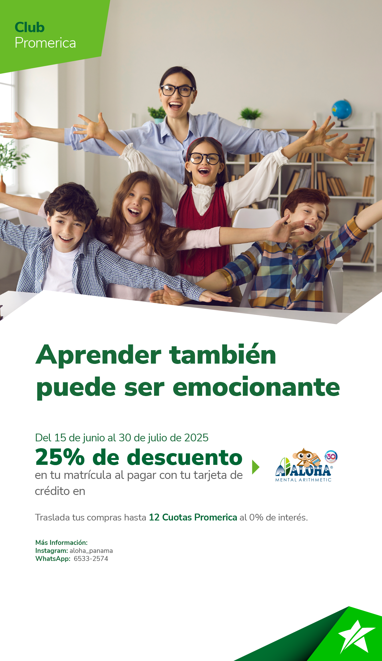 Período de la promoción del 15 de junio al 30 de julio de 2025. Recibe $25.00 de descuento en la matricula, agenda la clase de prueba 6533-2574. El descuento aplica únicamente al matricular al estudiante en la clase de prueba. Aplica solo en los centros de ALOHA Calle 50, Brisas del Golf, Anclas Mall y David. Este beneficio será aplicado por el comercio al pagar con las tarjetas de crédito de St. Georges Bank directamente en el punto de venta (POS) del Banco. No aplica con otras promociones o descuentos, ni descuento de jubilados. Solicita el beneficio de traslado a Cuotas Promerica hasta 12 meses al 0% de interés directo en el punto de venta (POS) de El Banco. El cliente debe realizar el pago de la cuota en la fecha indicada para mantener la tasa preferencial, adicional al pago mínimo correspondiente. La compra mínima para traslado a Cuotas es de $50.00. Cuotas Promerica va ligado al límite de crédito del cliente, no es un extrafinanciamiento. Aplica cargo por póliza de deuda sobre saldo. No participan las tarjetas de crédito regionales ni corporativas. El Banco se reserva el derecho de modificar características y beneficios ofertados en este arte. La responsabilidad del Banco se limita exclusivamente a aspectos propios del crédito otorgado a través de la tarjeta de crédito y no por los productos o servicios adquiridos mediante el uso de la tarjeta. Conoce más en clubpromerica.com/panama.