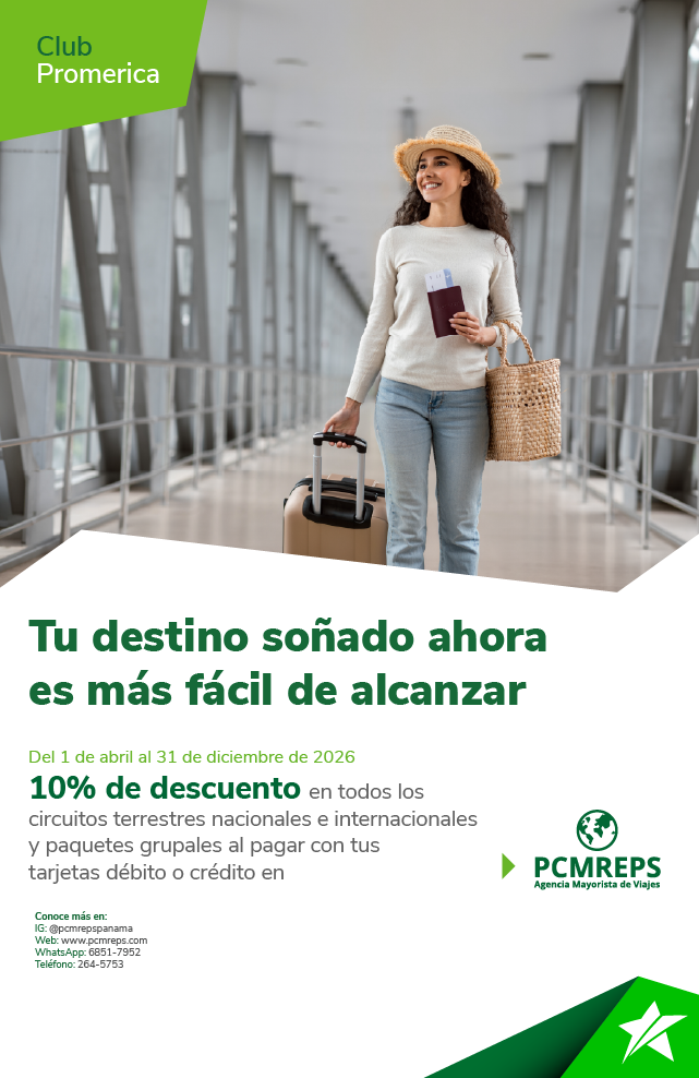 Promoción válida del 1 de abril al 31 de diciembre de 2026. Recibe 10% de descuento en todos los circuitos terrestres nacionales e internacionales y en paquetes grupales al pagar con tus tarjetas débito o crédito de St. Georges Bank. El cliente debe hacer referencia a la publicidad al momento de la cotización para que el descuento sea aplicado. El descuento aplica específicamente sobre la porción terrestre. No es acumulable con otras promociones, ferias de viajes o descuentos vigentes. Sujeto a disponibilidad de cupos. No aplican tarjetas de crédito regionales ni corporativas. Solicita el traslado de tus compras a cómodos plazos de 3, 6, 9 y 12 meses al 0 % de interés a través del POS (Punto de Venta) de St. Georges Bank. La compra mínima para trasladar a cuotas es de $50.00 y va ligado al límite de crédito del cliente, no es un extrafinanciamiento. Aplica seguro de saldo de deuda. Debe realizar el pago de la cuota en la fecha indicada para no generar intereses, adicional al pago mínimo correspondiente. El Banco se reserva el derecho de modificar características y beneficios ofertados en este arte. La responsabilidad del Banco se limita exclusivamente a aspectos propios del crédito otorgado a través de la tarjeta de crédito y no por los productos o servicios adquiridos mediante el uso de la tarjeta.