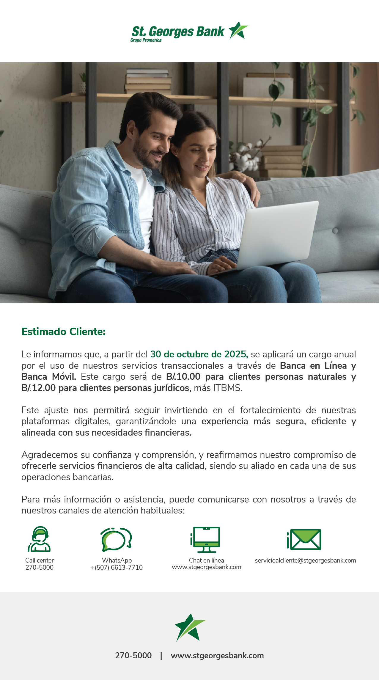 St. Georges Bank anunció que el BID Invest le otorgó un financiamiento por US$25 millones de dólares, cuyos fondos serán destinados al financiamiento de la pequeña y mediana empresa y también para el crecimiento del capital del Banco. BID Invest es parte del grupo Banco Interamericano de Desarrollo (BID) y su apoyo reafirma el compromiso de St. Georges Bank de seguir creciendo y aportando al desarrollo sostenible de Panamá.